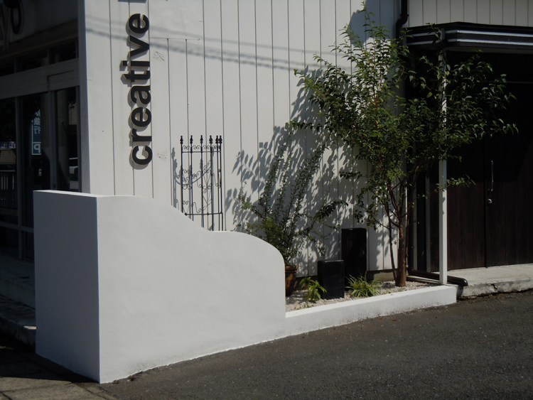 白の外壁に合わせて白の塗壁を造り、既存の構築物を隠すとともに看板を取り付けました。